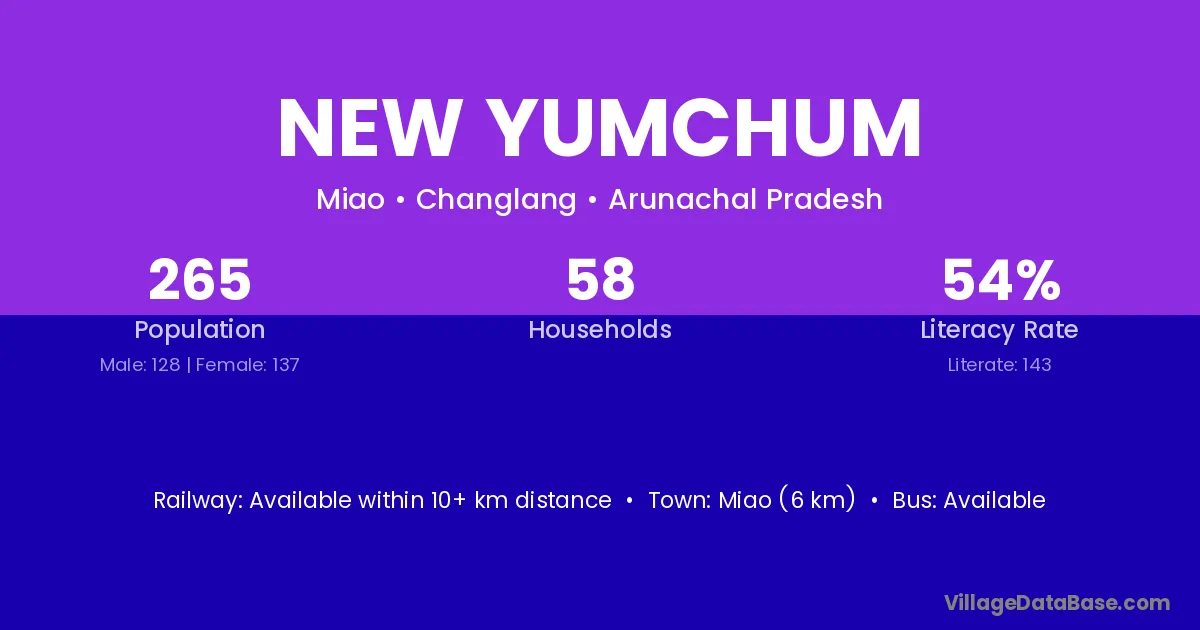 Miao (6 km) is the nearest town to New Yumchum village for major economic activities and is located approximately 6 km away.