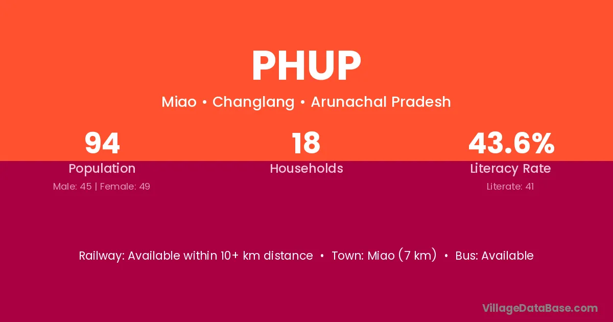 Miao (7 km) is the nearest town to Phup village for major economic activities and is located approximately 7 km away.