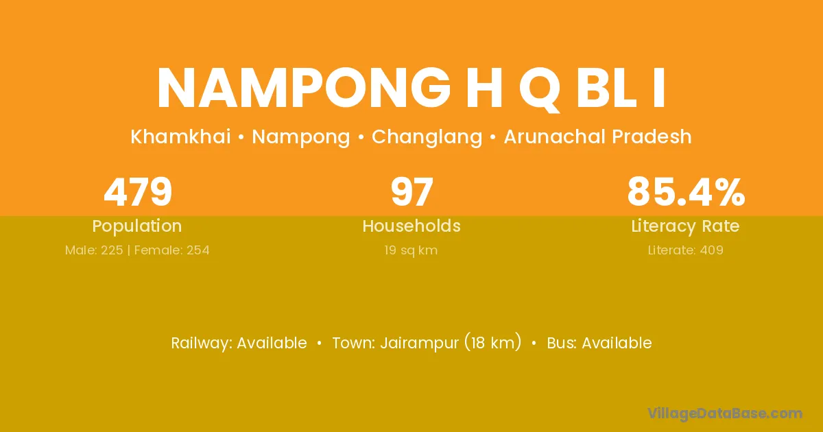 Jairampur (18 km) is the nearest town to Nampong H Q Bl I village for major economic activities and is located approximately 18 km away.