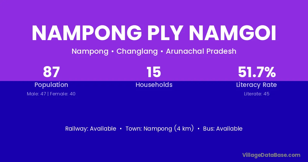 Nampong Ply Namgoi village has a total population of 87 people, of which 47 are males and 40 are females.