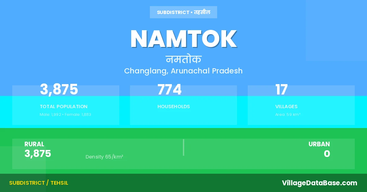 Namtok is a town and Circle in the Changlang district of the Arunachal Pradesh. In India, a Circle is a subdivision of a district responsible for the administration and revenue collection of a specific area within the district. Circles play a crucial role in the local governance structure, contributing significantly to the development and administration of their communities.