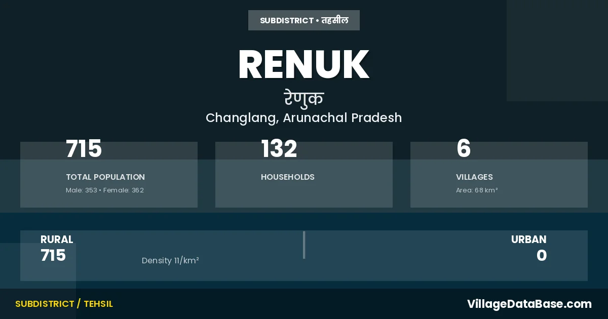 According to the 2011 census The total area of Renuk Circle is 68 km², with a population of 715 people. The population density is 11 inhabitants per square kilometre, and there are approximately 132 houses in the sub district.