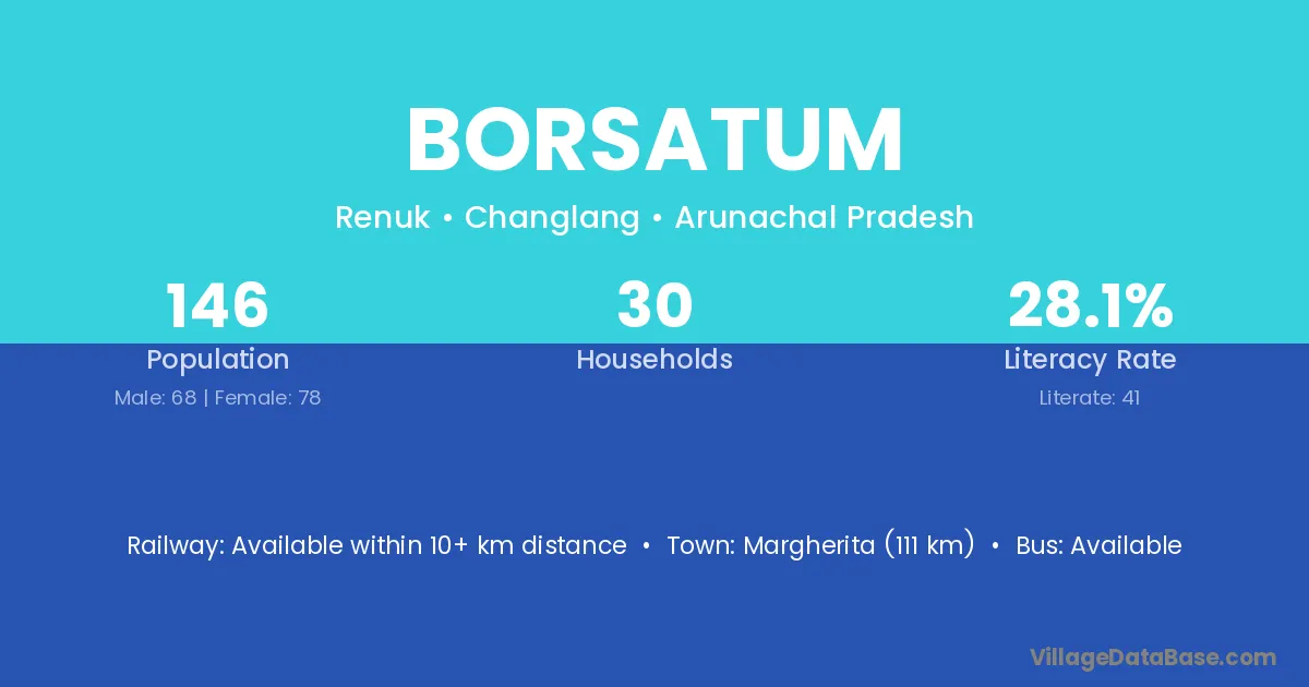 Margherita (111 km) is the nearest town to Borsatum village for major economic activities and is located approximately 111 km away.
