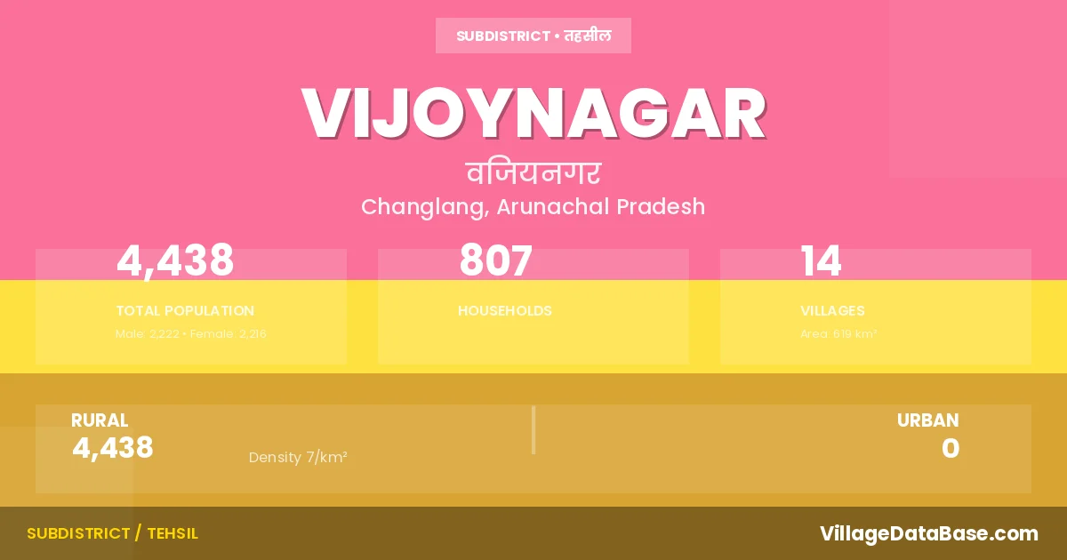 Vijoynagar is a town and Circle in the Changlang district of the Arunachal Pradesh. In India, a Circle is a subdivision of a district responsible for the administration and revenue collection of a specific area within the district. Circles play a crucial role in the local governance structure, contributing significantly to the development and administration of their communities.