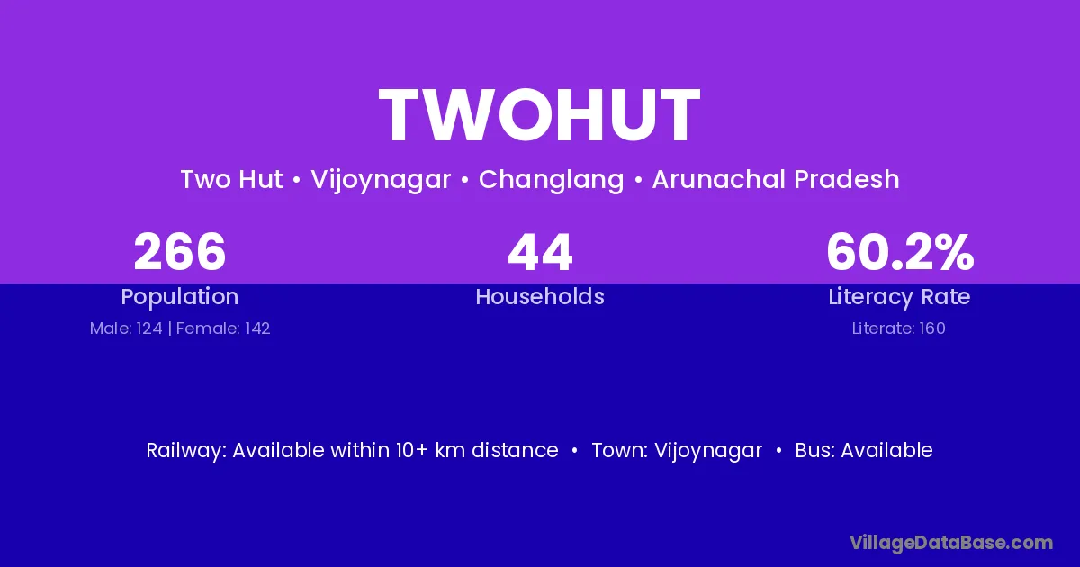Twohut village has a total population of 266 people, of which 124 are males and 142 are females.