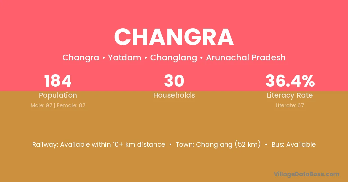 Changlang (52 km) is the nearest town to Changra village for major economic activities and is located approximately 52 km away.