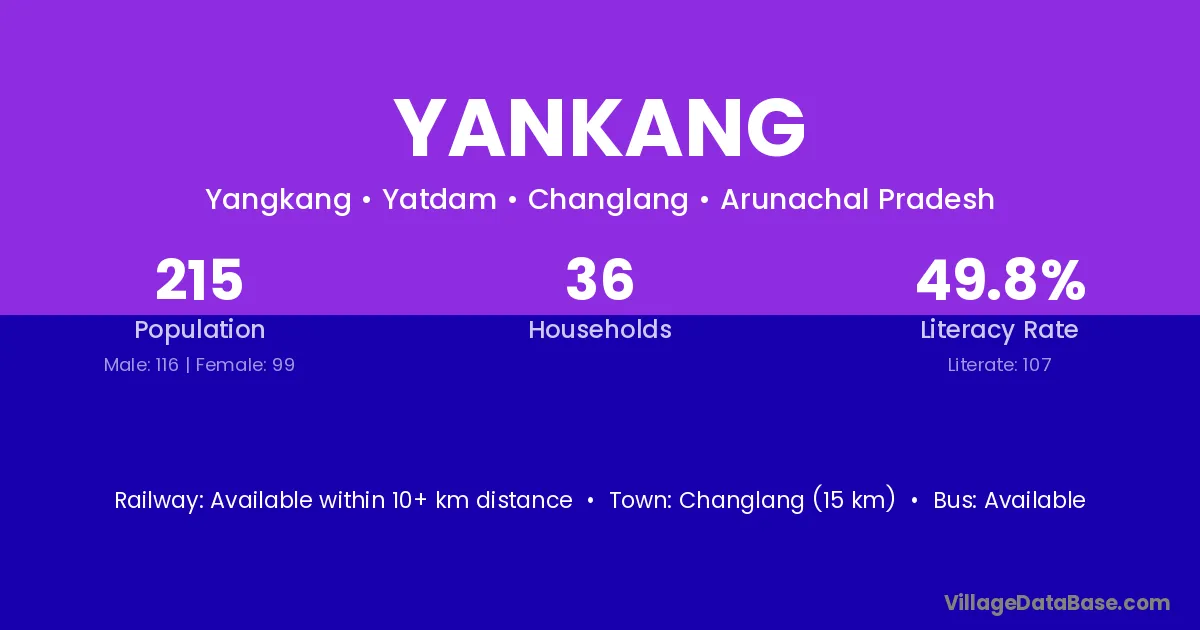Changlang (15 km) is the nearest town to Yankang village for major economic activities and is located approximately 15 km away.