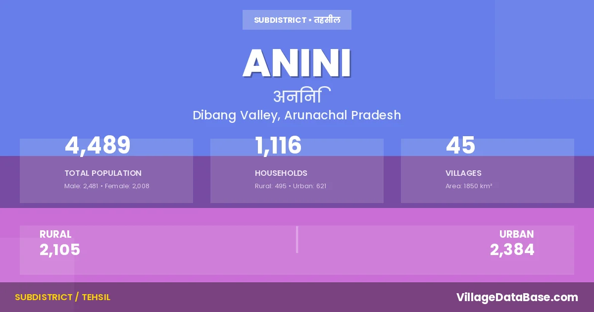 According to the 2011 census The total area of Anini Circle is 1850 km², with a population of 4489 people. The population density is 2 inhabitants per square kilometre, and there are approximately 1116 houses in the sub district.