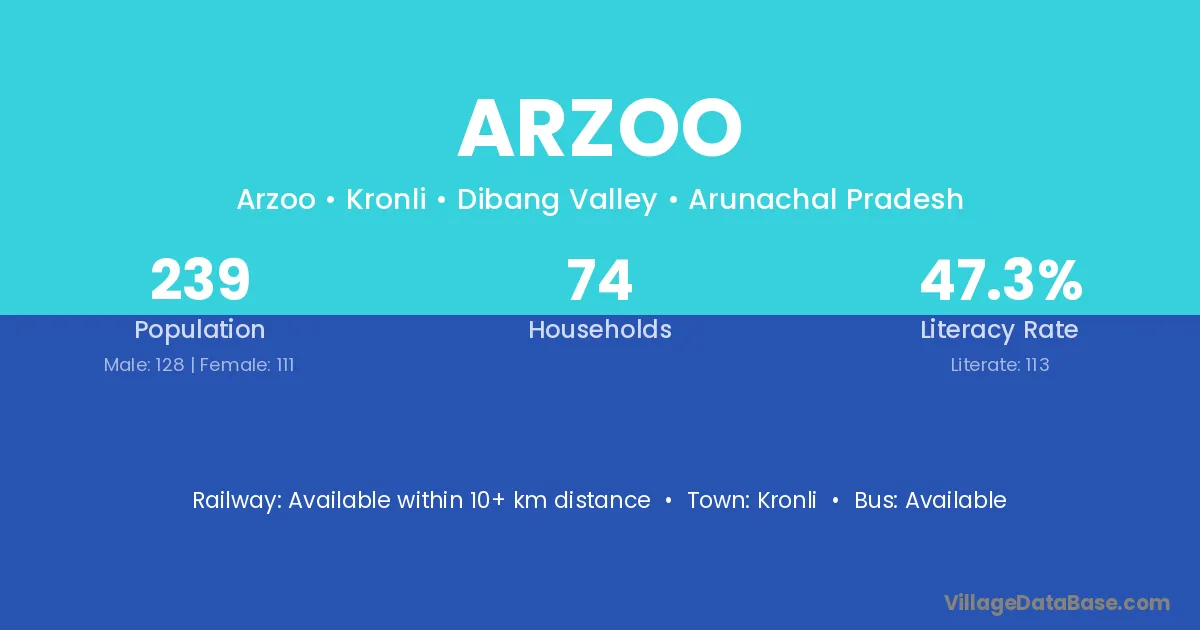 Arzoo village has a total population of 239 people, of which 128 are males and 111 are females.