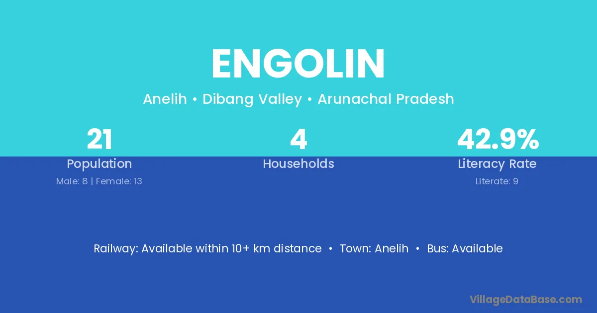 The literacy rate of Engolin village is 52.94%. Male literacy stands at 60.00% and female literacy at 42.86%.
