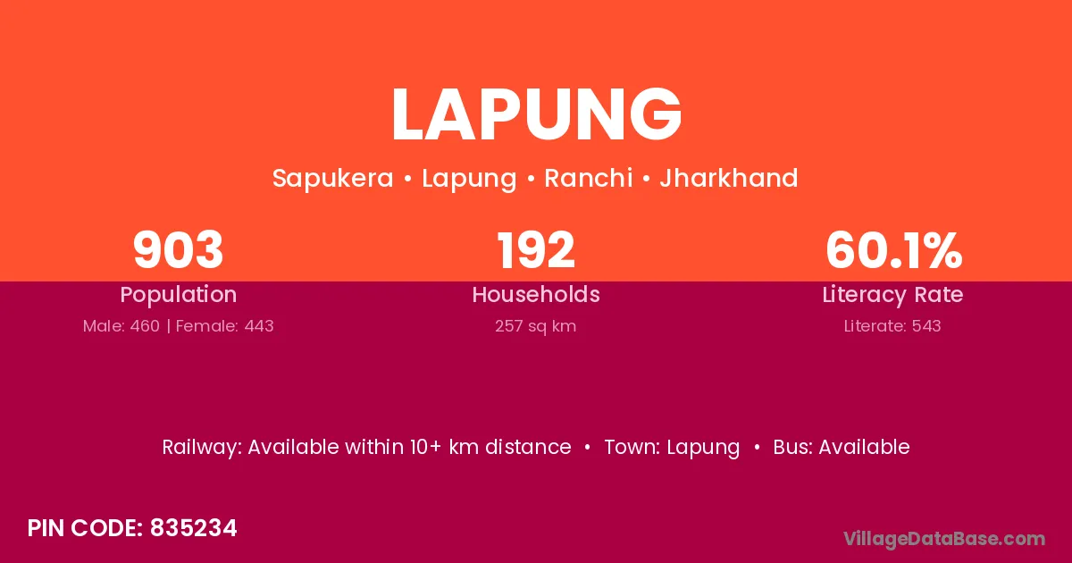 The literacy rate of Lapung village is 47.06%. Male literacy stands at 52.08% and female literacy at 40.54%.