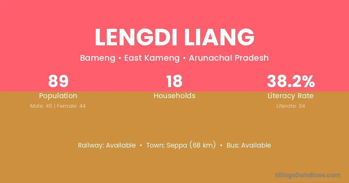 Seppa (68 km) is the nearest town to Lengdi Liang village for major economic activities and is located approximately 68 km away.