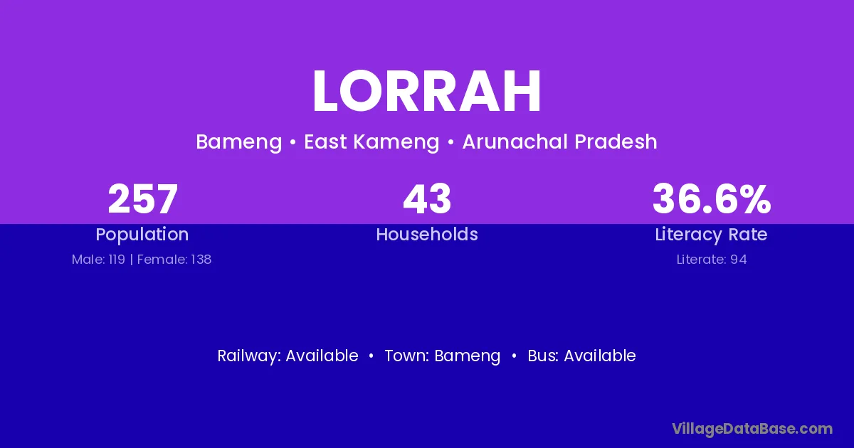 The literacy rate of Lorrah village is 36.58%. Male literacy stands at 50.42% and female literacy at 24.64%.