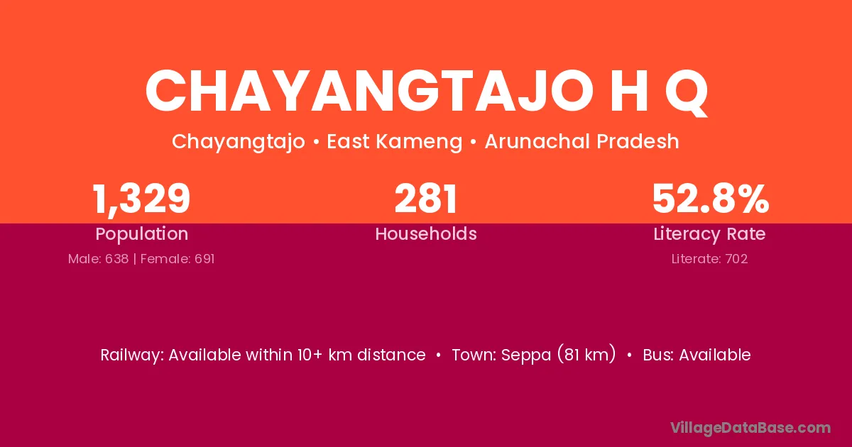 Seppa (81 km) is the nearest town to Chayangtajo H Q village for major economic activities and is located approximately 81 km away.
