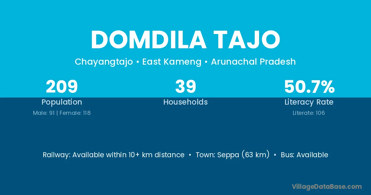 Seppa (63 km) is the nearest town to Domdila Tajo village for major economic activities and is located approximately 63 km away.