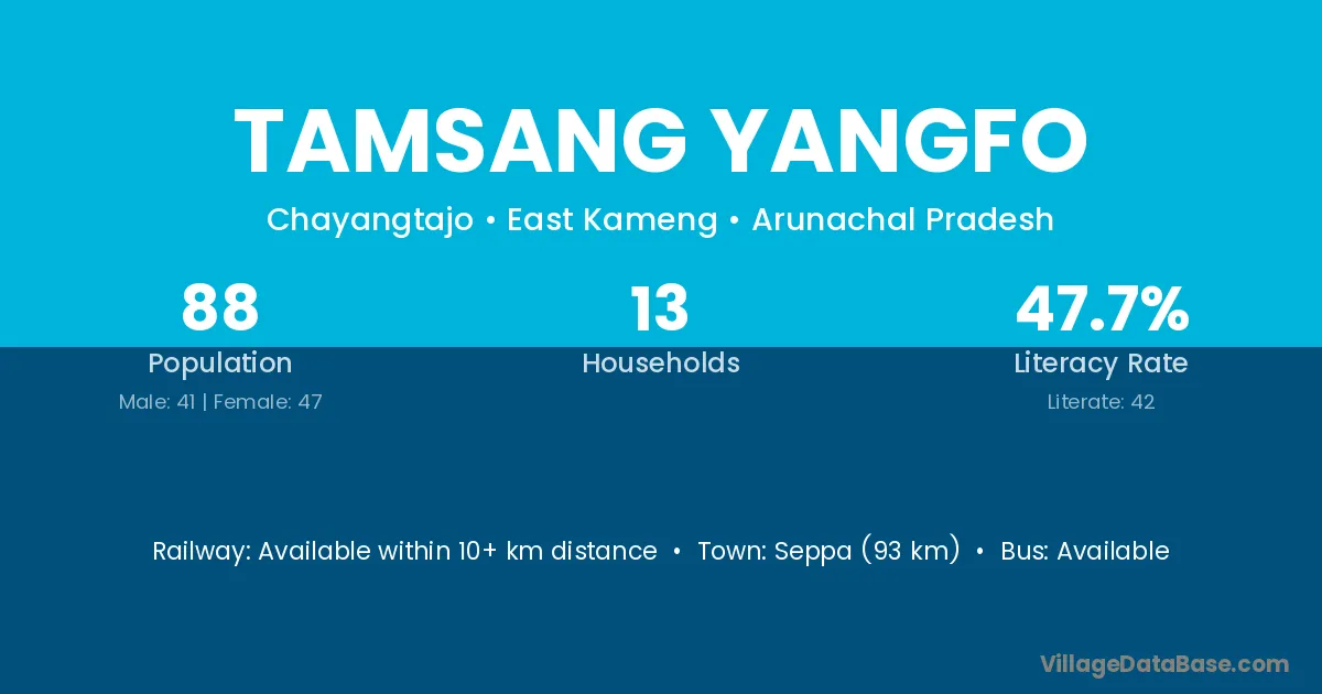 Seppa (93 km) is the nearest town to Tamsang Yangfo village for major economic activities and is located approximately 93 km away.