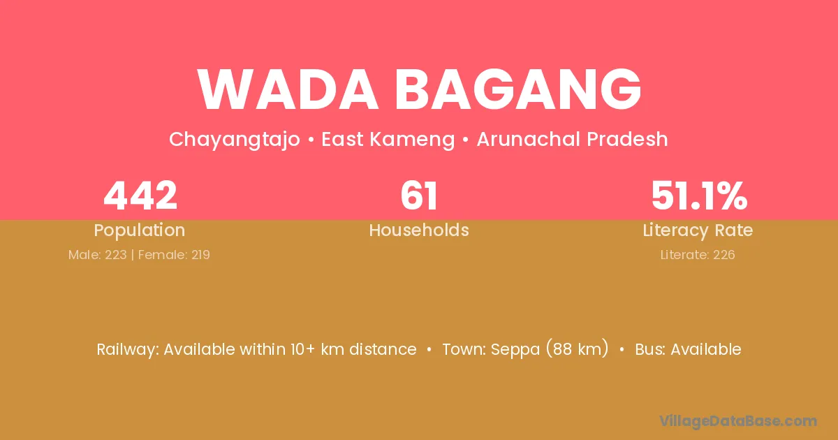 Seppa (88 km) is the nearest town to Wada Bagang village for major economic activities and is located approximately 88 km away.