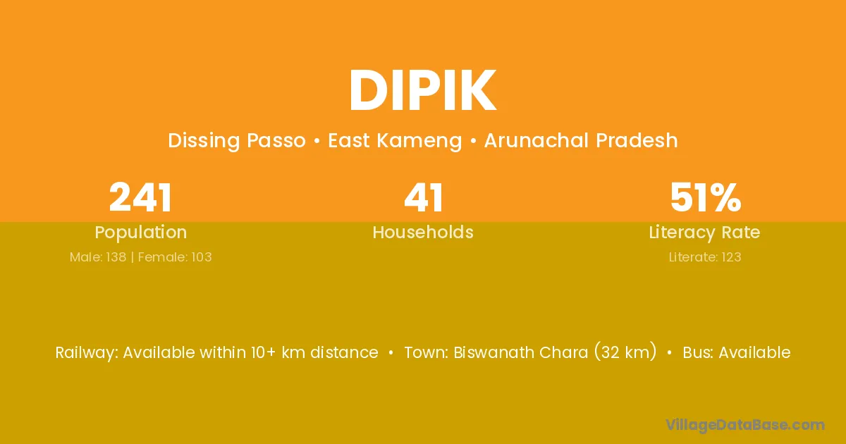 Biswanath Chara (32 km) is the nearest town to Dipik village for major economic activities and is located approximately 32 km away.
