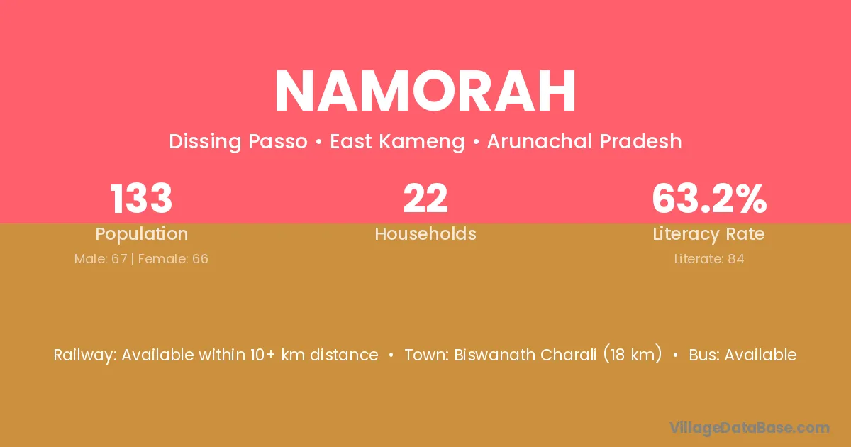 Biswanath Charali (18 km) is the nearest town to Namorah village for major economic activities and is located approximately 18 km away.