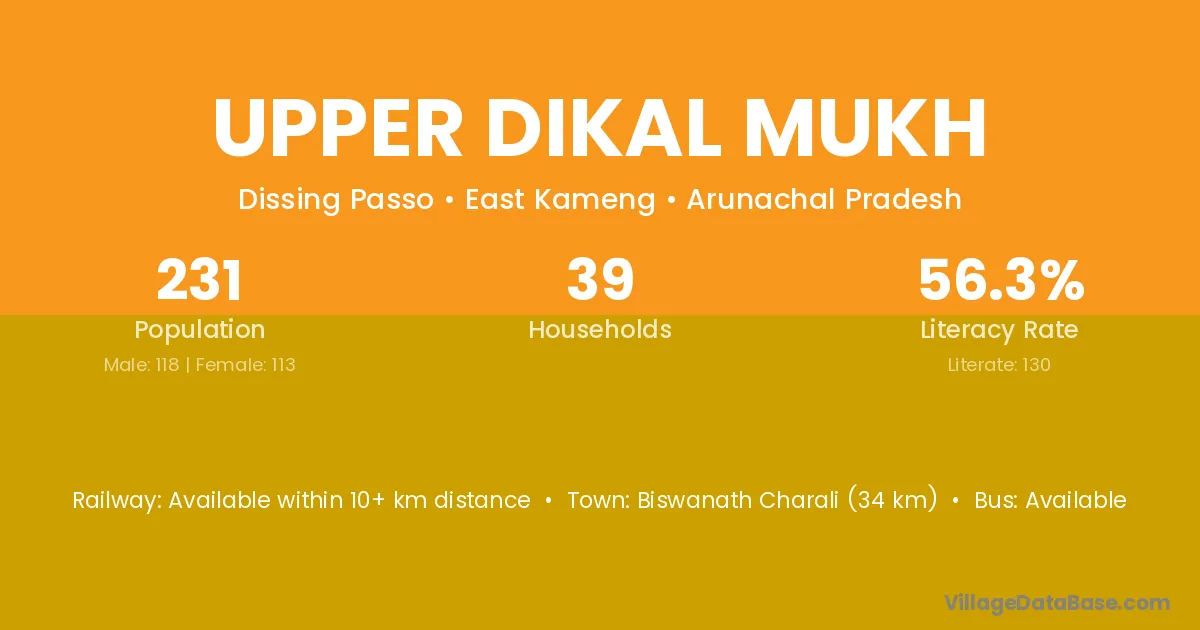 Upper Dikal Mukh village has a total population of 231 people, of which 118 are males and 113 are females.