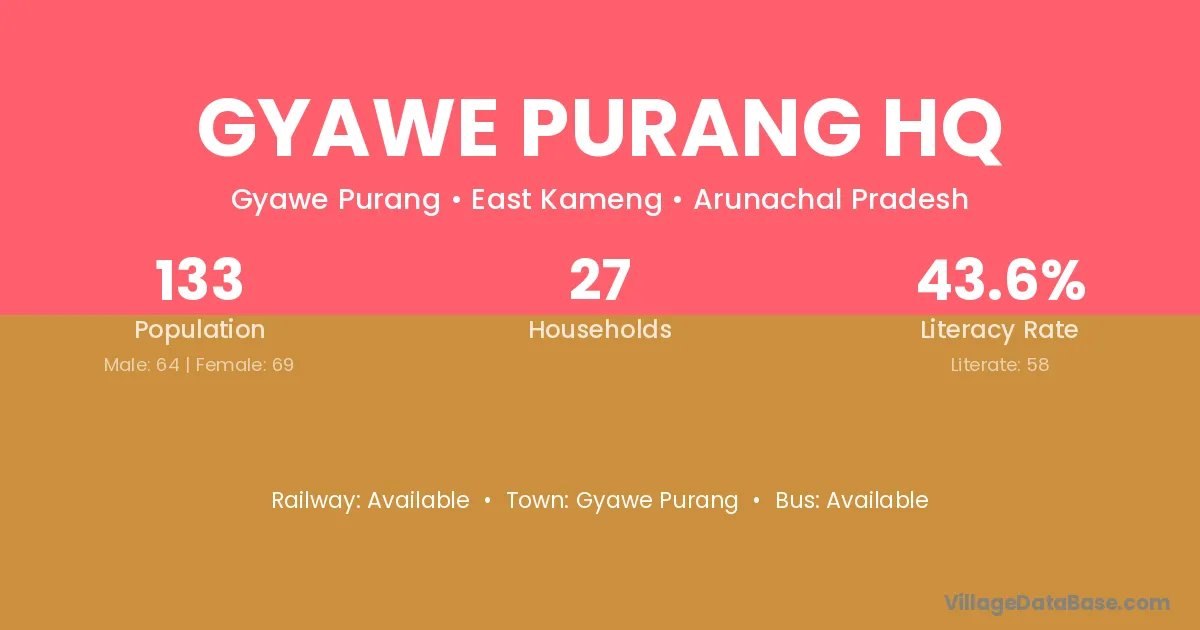 Gyawe Purang Hq village has a total population of 133 people, of which 64 are males and 69 are females.