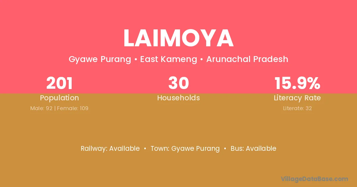 Laimoya village has a total population of 201 people, of which 92 are males and 109 are females.