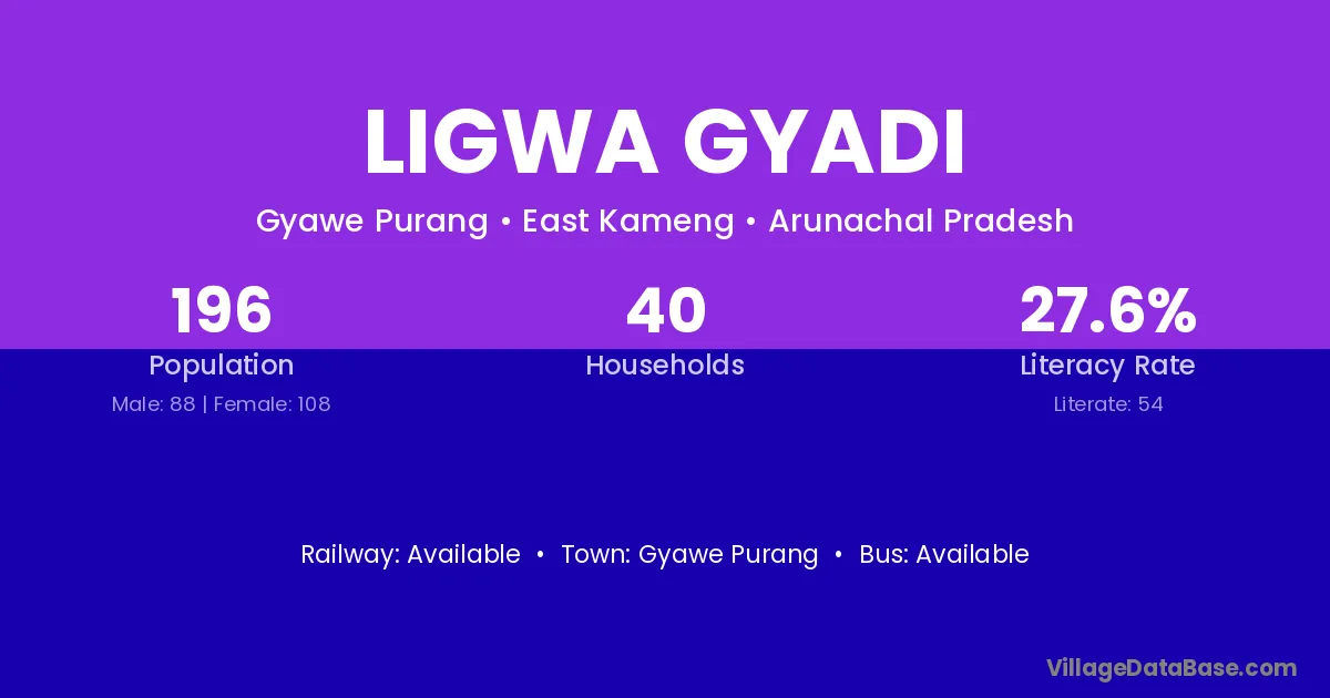 Ligwa Gyadi village has a total population of 196 people, of which 88 are males and 108 are females.
