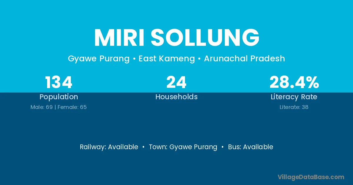 Miri Sollung village has a total population of 134 people, of which 69 are males and 65 are females.