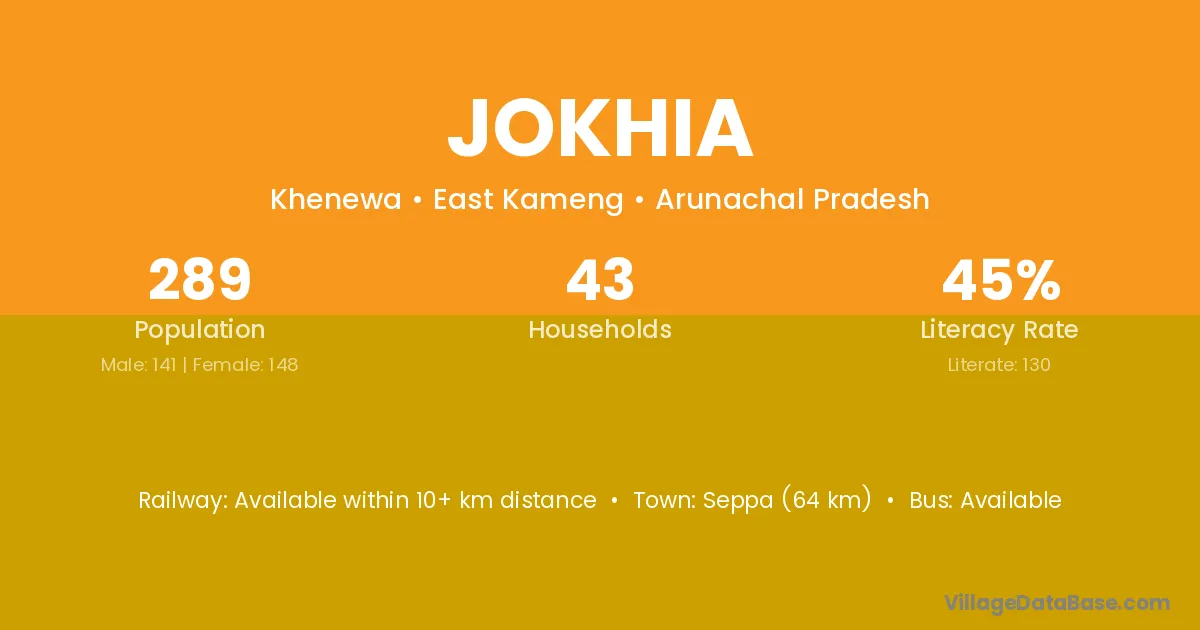 Seppa (64 km) is the nearest town to Jokhia village for major economic activities and is located approximately 64 km away.