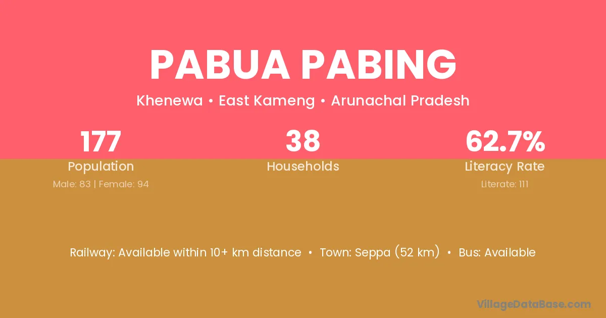 Seppa (52 km) is the nearest town to Pabua Pabing village for major economic activities and is located approximately 52 km away.