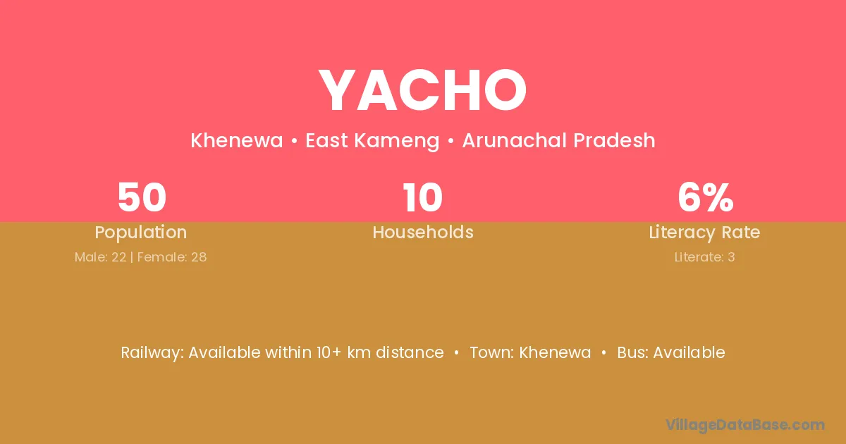 Yacho village has a total population of 50 people, of which 22 are males and 28 are females.