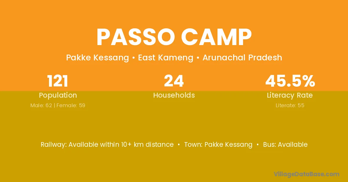 The literacy rate of Passo Camp village is 45.45%. Male literacy stands at 58.06% and female literacy at 32.20%.