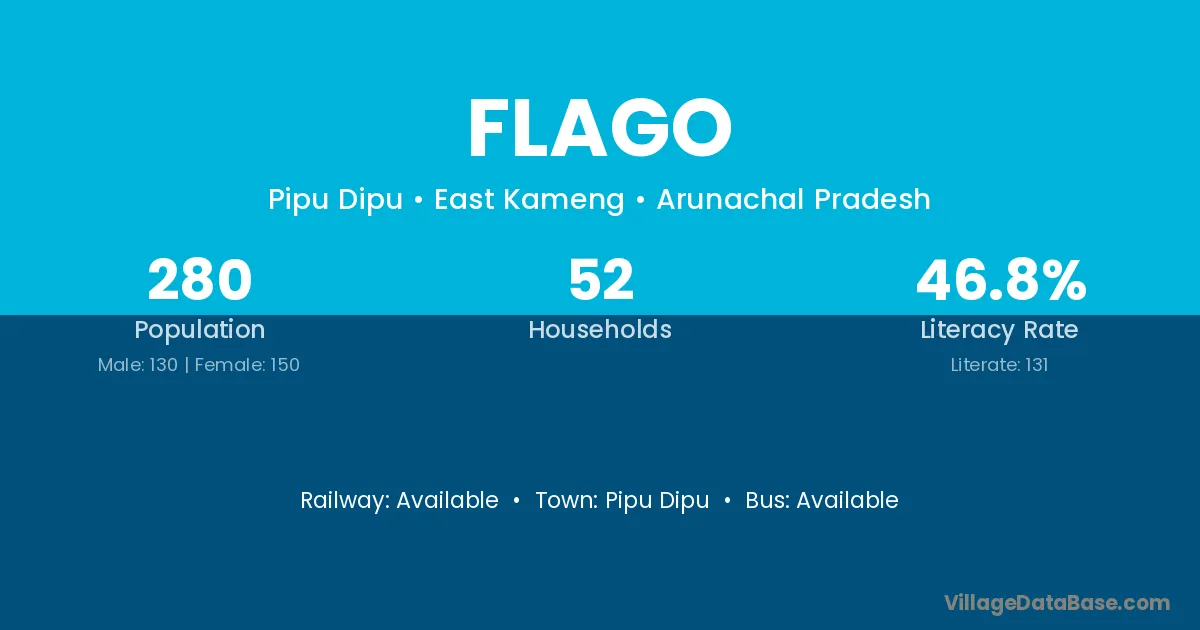 The literacy rate of Flago village is 46.79%. Male literacy stands at 55.38% and female literacy at 39.33%.