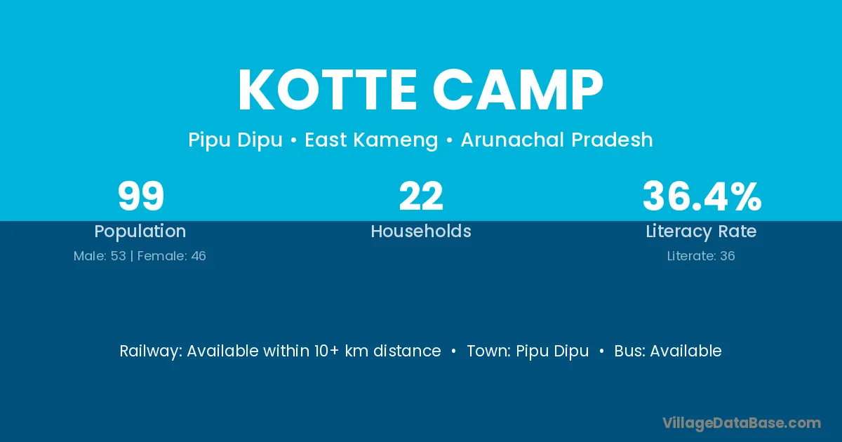 The literacy rate of Kotte Camp village is 36.36%. Male literacy stands at 39.62% and female literacy at 32.61%.
