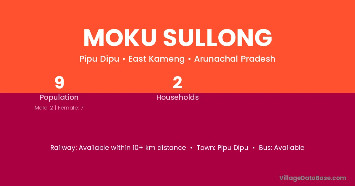 Moku Sullong village has a total population of 9 people, of which 2 are males and 7 are females.