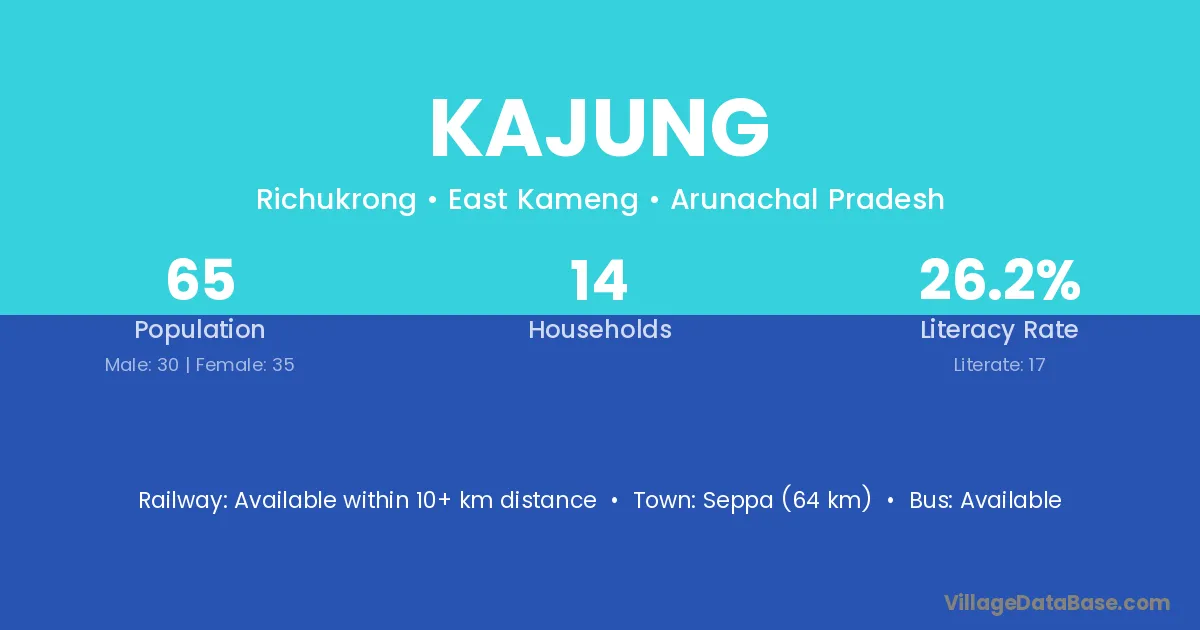 Kajung village has a total population of 65 people, of which 30 are males and 35 are females.
