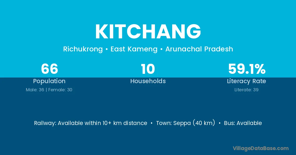 Seppa (40 km) is the nearest town to Kitchang village for major economic activities and is located approximately 40 km away.