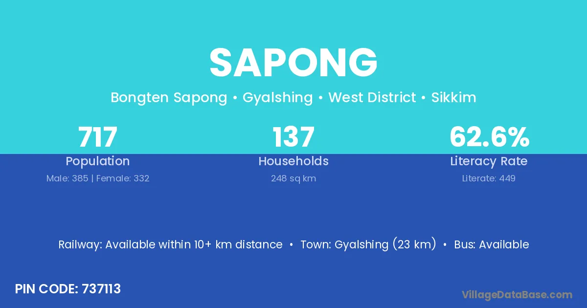 Seppa (40 km) is the nearest town to Sapong village for major economic activities and is located approximately 40 km away.