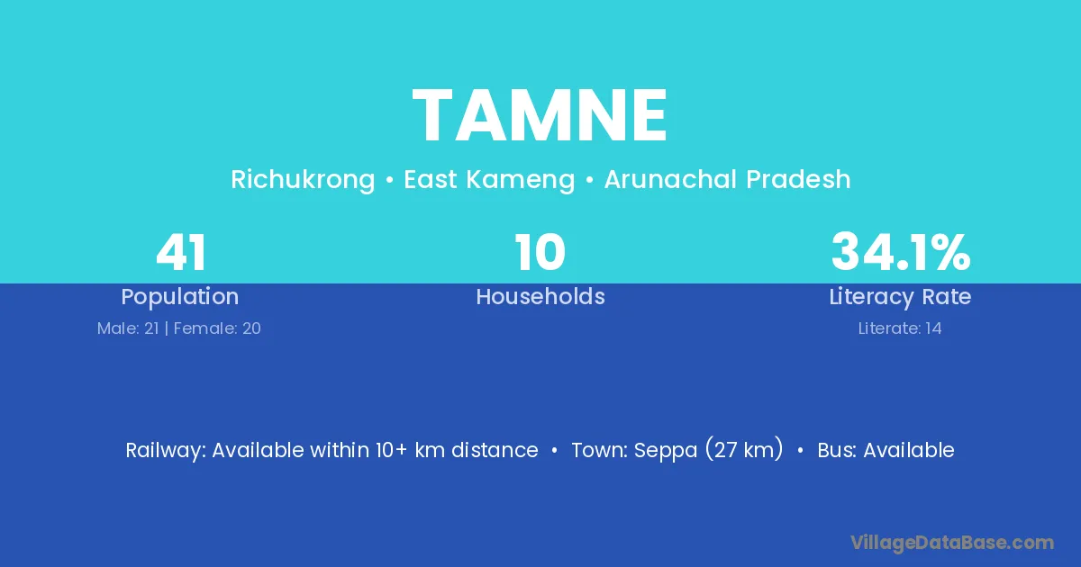 Seppa (27 km) is the nearest town to Tamne village for major economic activities and is located approximately 27 km away.