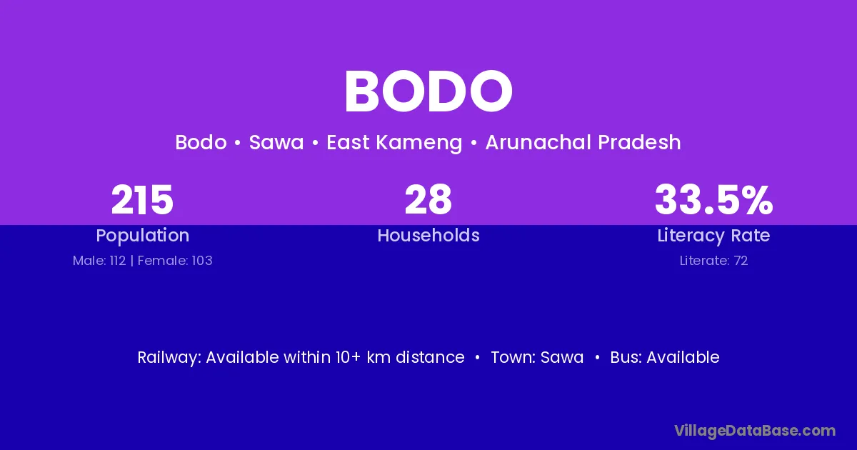 Bodo village has a total population of 215 people, of which 112 are males and 103 are females.