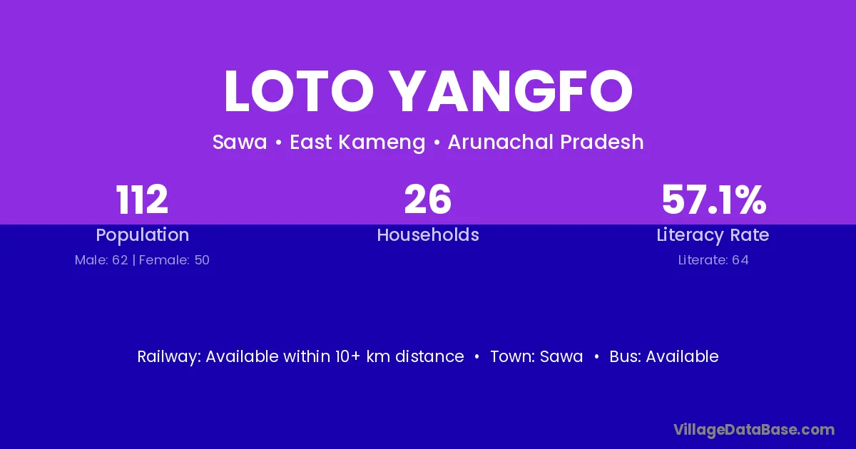 Loto Yangfo village has a total population of 112 people, of which 62 are males and 50 are females.