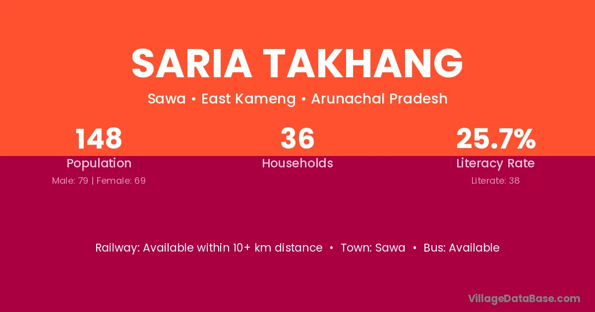 Saria Takhang village has a total population of 148 people, of which 79 are males and 69 are females.
