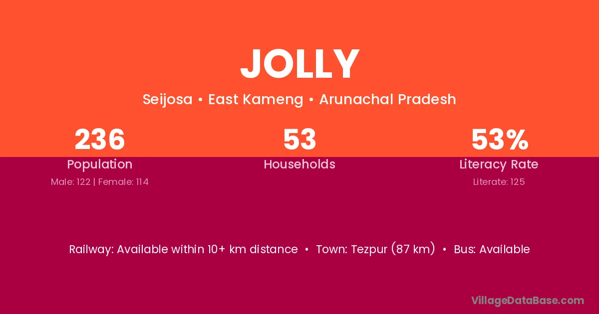 Tezpur (87 km) is the nearest town to Jolly village for major economic activities and is located approximately 87 km away.
