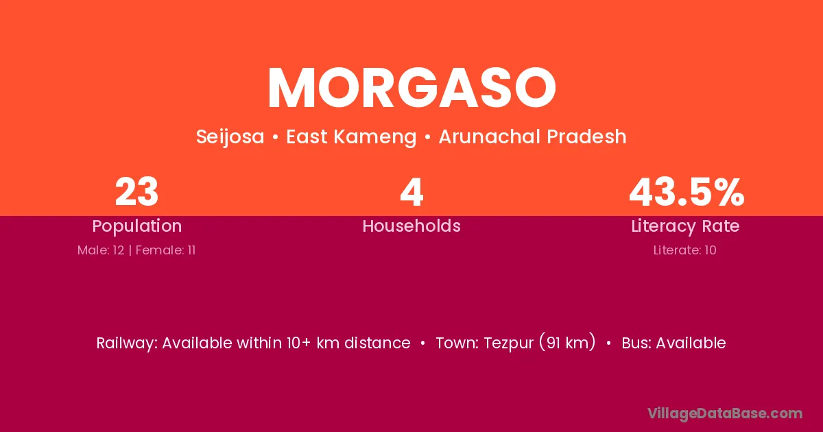 Tezpur (91 km) is the nearest town to Morgaso village for major economic activities and is located approximately 91 km away.