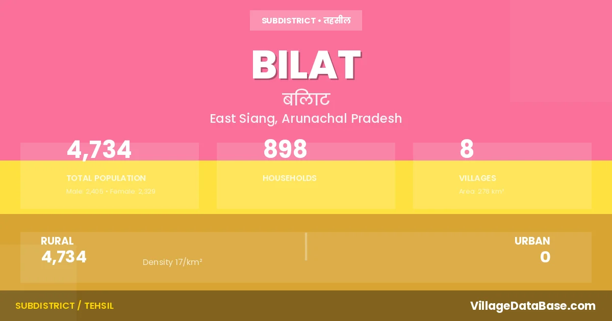 Bilat is a town and Circle in the East Siang district of the Arunachal Pradesh. In India, a Circle is a subdivision of a district responsible for the administration and revenue collection of a specific area within the district. Circles play a crucial role in the local governance structure, contributing significantly to the development and administration of their communities.