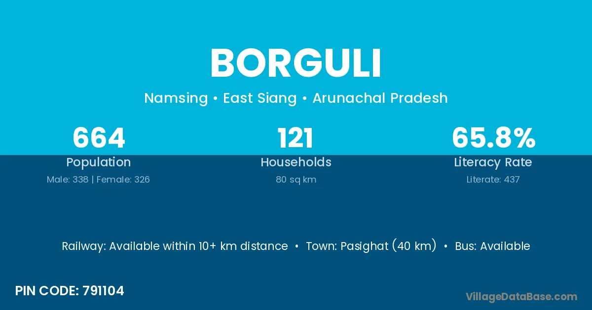 Pasighat (40 km) is the nearest town to Borguli village for major economic activities and is located approximately 40 km away.