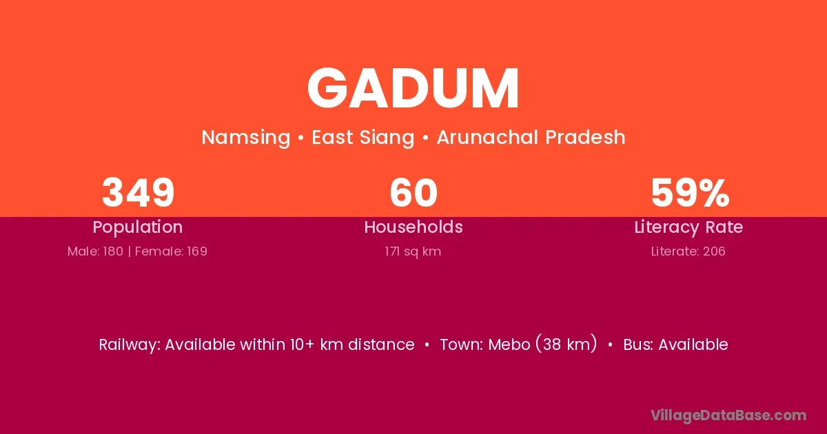 Mebo (38 km) is the nearest town to Gadum village for major economic activities and is located approximately 38 km away.