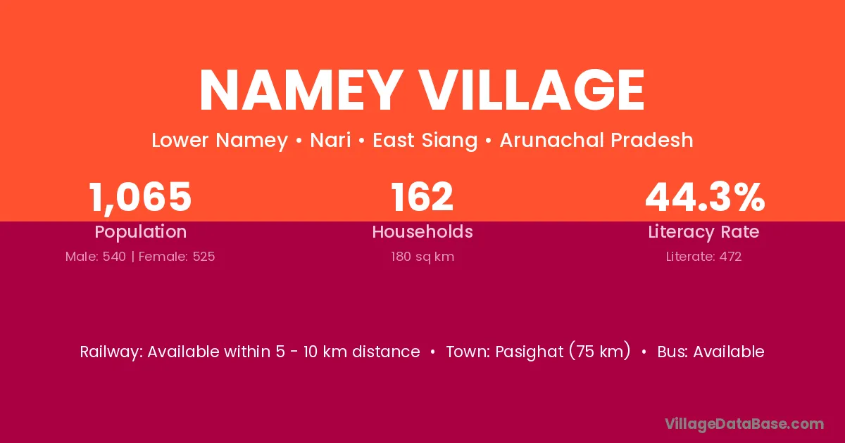 Pasighat (75 km) is the nearest town to Namey Village village for major economic activities and is located approximately 75 km away.
