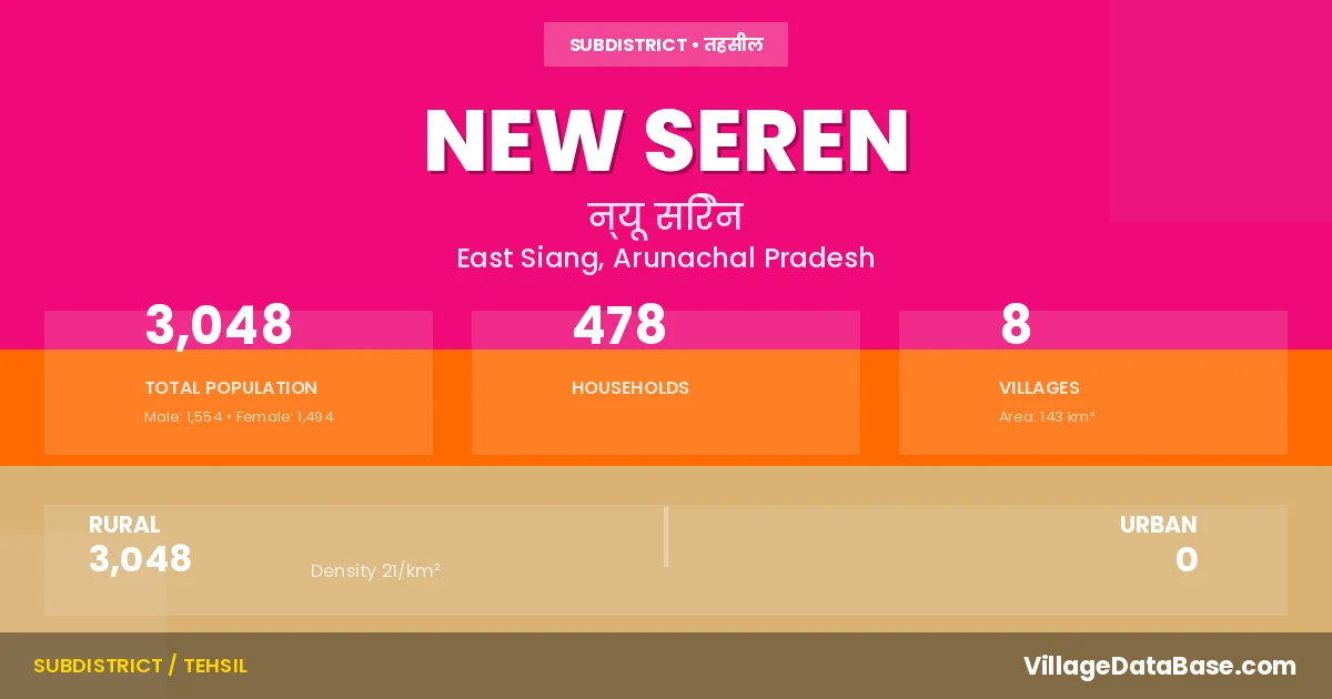 New Seren is a town and Circle in the East Siang district of the Arunachal Pradesh. In India, a Circle is a subdivision of a district responsible for the administration and revenue collection of a specific area within the district. Circles play a crucial role in the local governance structure, contributing significantly to the development and administration of their communities.