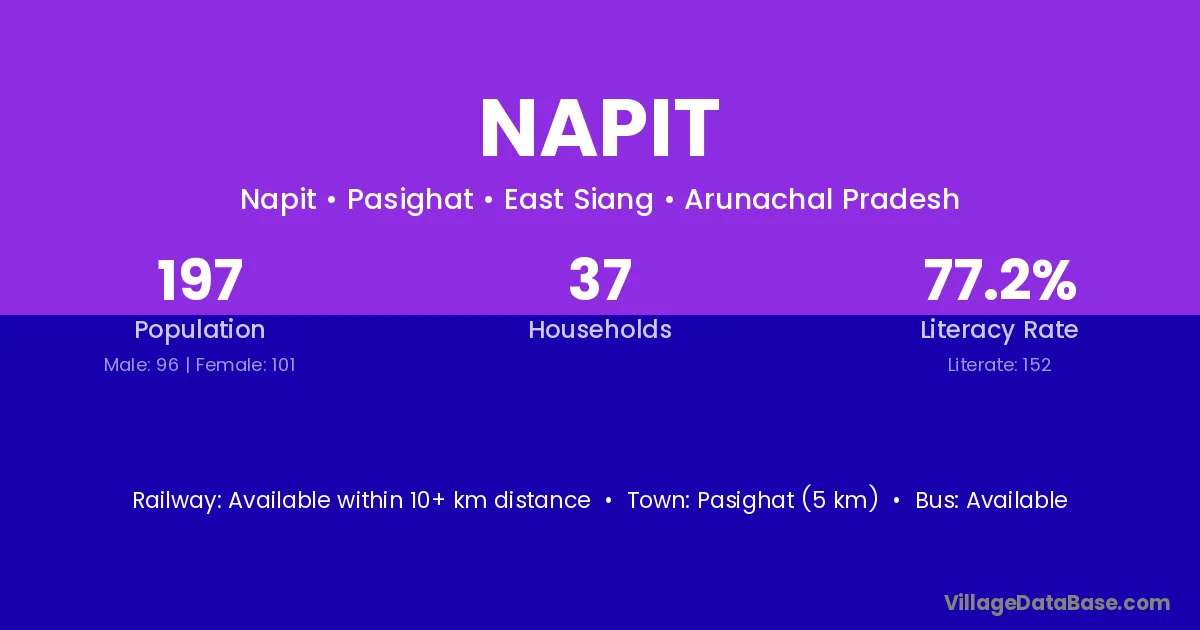 Pasighat (5 km) is the nearest town to Napit village for major economic activities and is located approximately 5 km away.